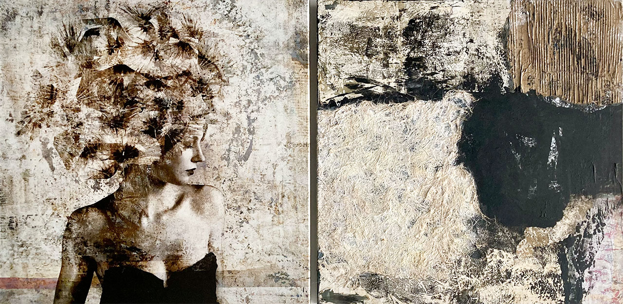 Links: Fotocollage auf Canvas -Leinen / Rechts: Collage mit Papieren und Steinmehlen